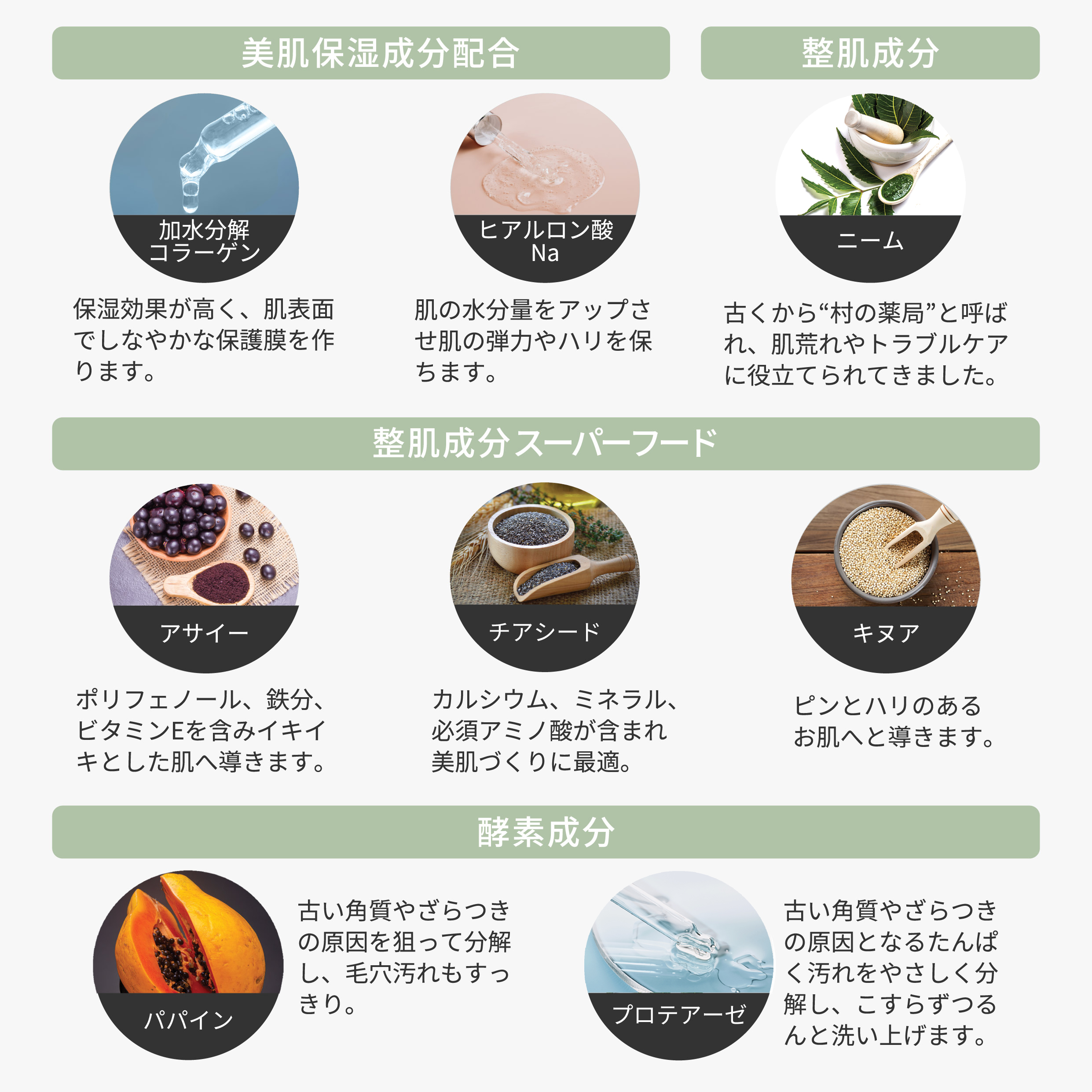 酵素が古い角質や毛穴の汚れを洗い流し、ニームをはじめとする植物由来成分が、肌をすこやかに保ちます。