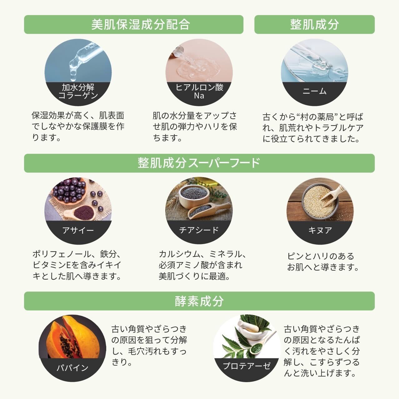 商品詳細 酵素が古い角質や毛穴汚れを分解、ニームをはじめ植物由来成分で肌を整えます。保湿成分配合で、洗うたびしっとりなめらか。